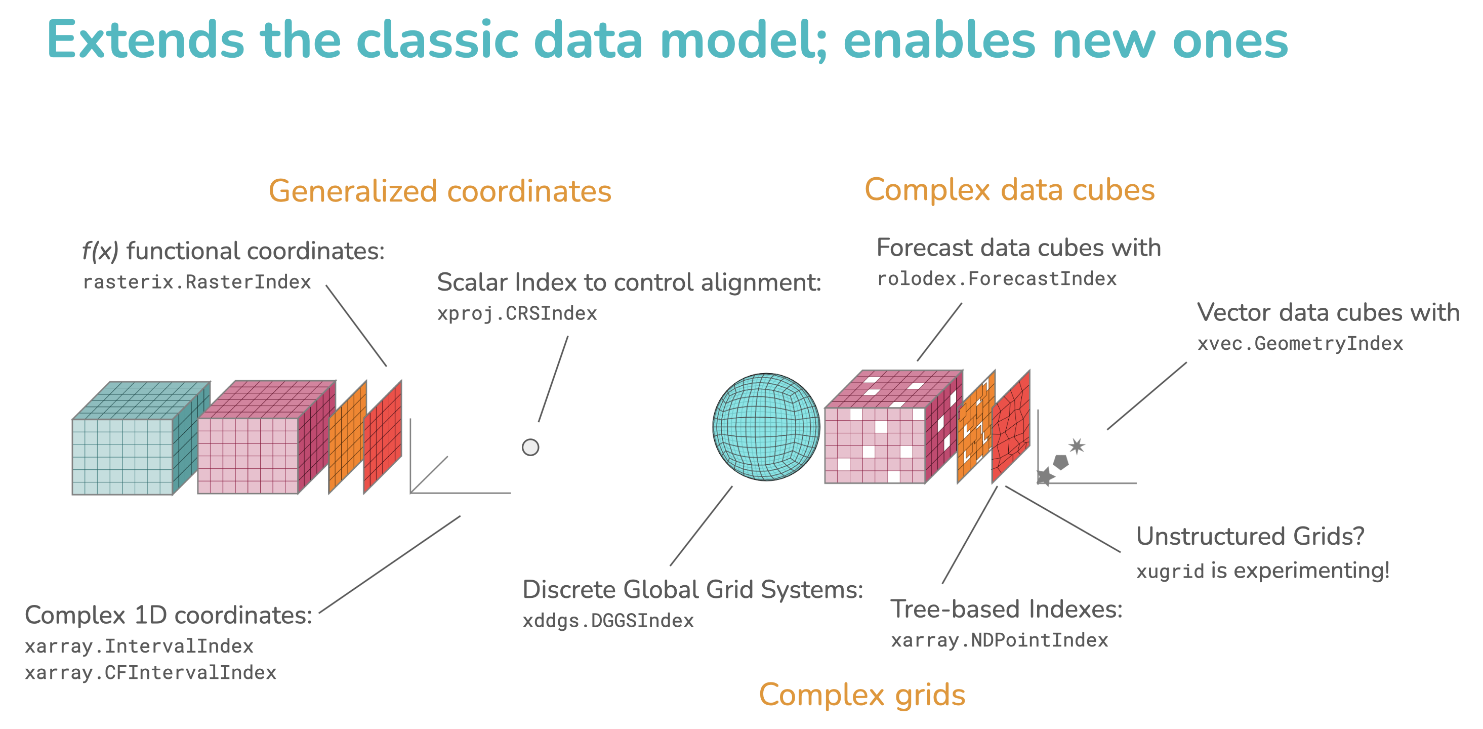 In addition to a few new built-in indexes, xarray.Index provides an API that allows dealing with coordinate data and metadata in a highly customizable way for the most common Xarray operations such as selalignconcatstack. This is a powerful extension mechanism that is very important for supporting a multitude of domain-specific data structures. Here are a few examples below.
